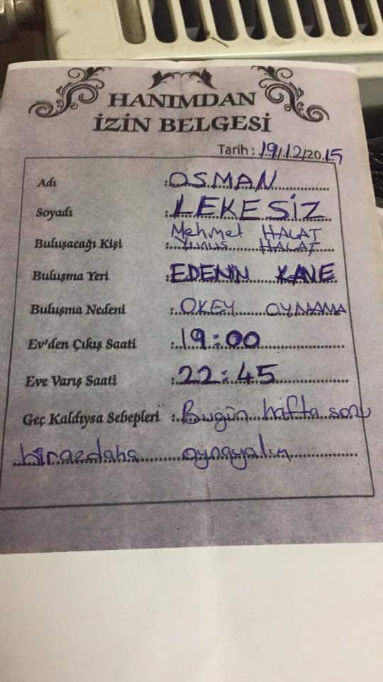 Beyler, ortamdaki hanımcı arkadaş. Hanımdan İzin Belgesi. Beyaz kağı üzerine siyah yazı. Doldurturum tabi hatta noter onaylı olacak. Görüş hala geçerli mi? Yolculardan seyahat izin belgesi isteyecek mi? Seyahat İzin Belgesi ” taleplerini, Mayıs Perşembe günü, saat 09. E-Devlet, İçişleri Bakanlığı, E-Başvuru. Evlenelim, o zaten her şeye değer. Bir izin belgesi alı veririz olur biter.